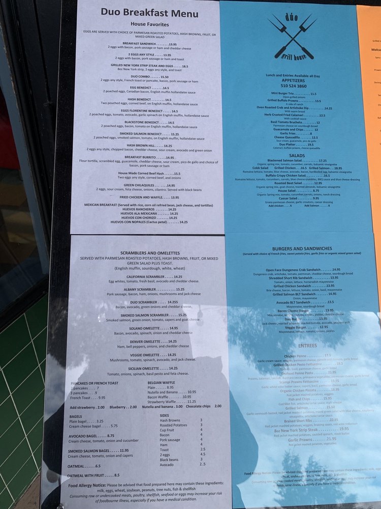 Duo Grill House, located in Albany, CA, offers a delightful American breakfast and brunch experience. This cozy spot shines with its diverse menu, catering to families, groups, and even vegans, ensuring there's something for everyone. Begin your day with hearty scramblers and omelettes, like the Albany Scrambler packed with chicken apple sausage or the California Scrambler featuring fresh avocado and tomato.